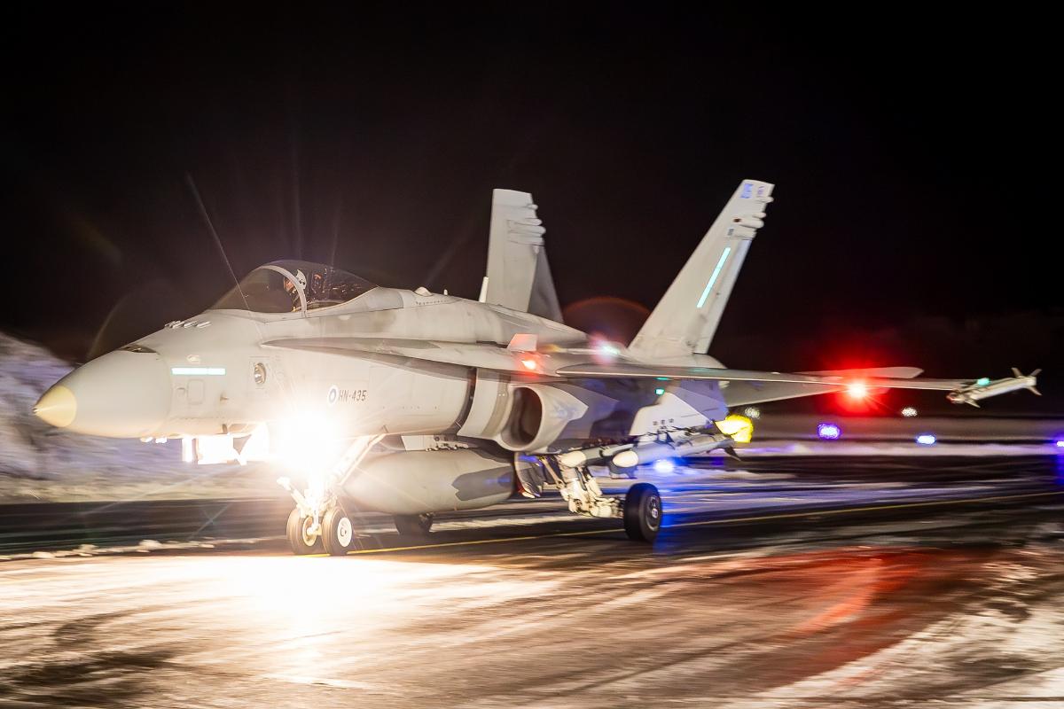 Karjalan lennoston Hävittäjälentolaivue 31 lentää F/A-18 Hornet -hävittäjillä lentokoulutusohjelmien mukaisia yölentoja Rissalan tukikohdasta: