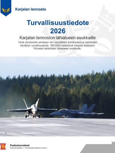 Karjalan lennoston turvallisuustiedote 2026 Tämä yleistiedote(pdf) annetaan lain vaarallisten kemikaalien ja räjähteiden käsittelyn turvallisuudesta 309/2005 mukaisesti Karjalan...