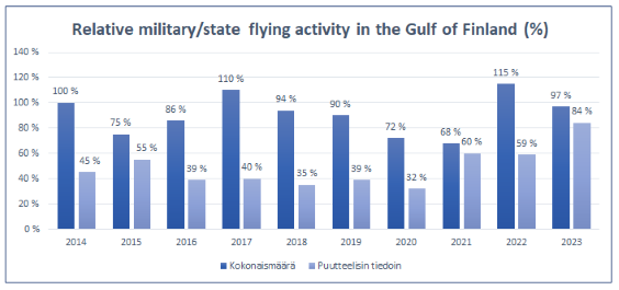 Puutteellisin tiedoin tehtyjen lentojen osuus Venäjän valtionilma-alusten lentotoiminnasta Suomenlahden kansainvälisessä ilmatilassa oli vuonna 2023 noin 84 prosenttia kokonaismäärästä.