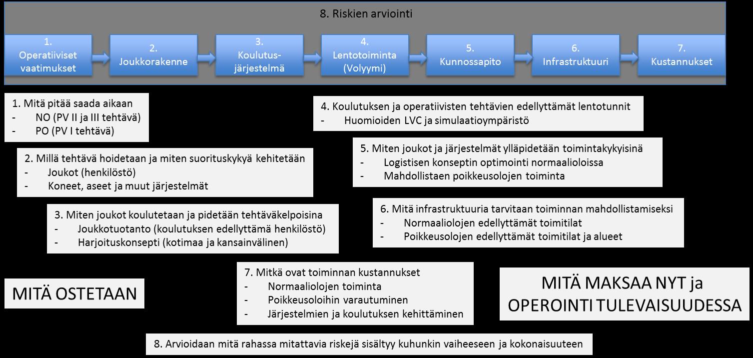 Other costs presented in the life cycle model (items 1.-4. and 6.-8.) are assessed by the Air Force Command using the Life Cycle Cost (LCC) calculation model based on the cost information produced by the Defence Forces Logistics Command. The analysis is made by using an information model used in the Defence Forces which includes the following items: mode of operations of troops conducting tasks set for the HX system, set up of organisation, training and exercise system, materiel procurements, personnel, leadership and leadership training required for the activities, provision of support and facilities, and interoperability and information.
