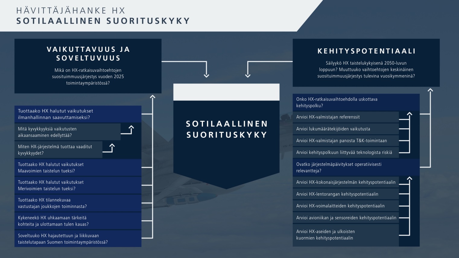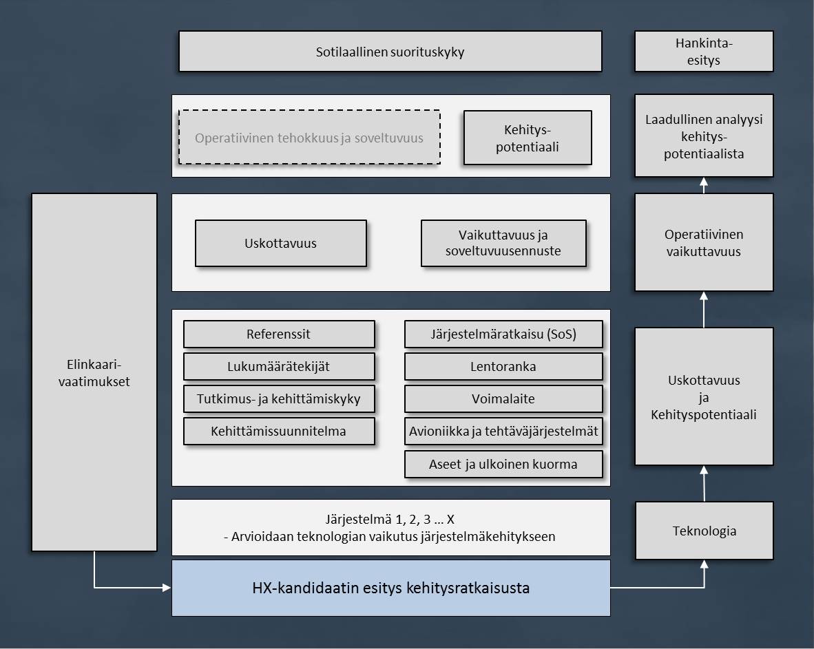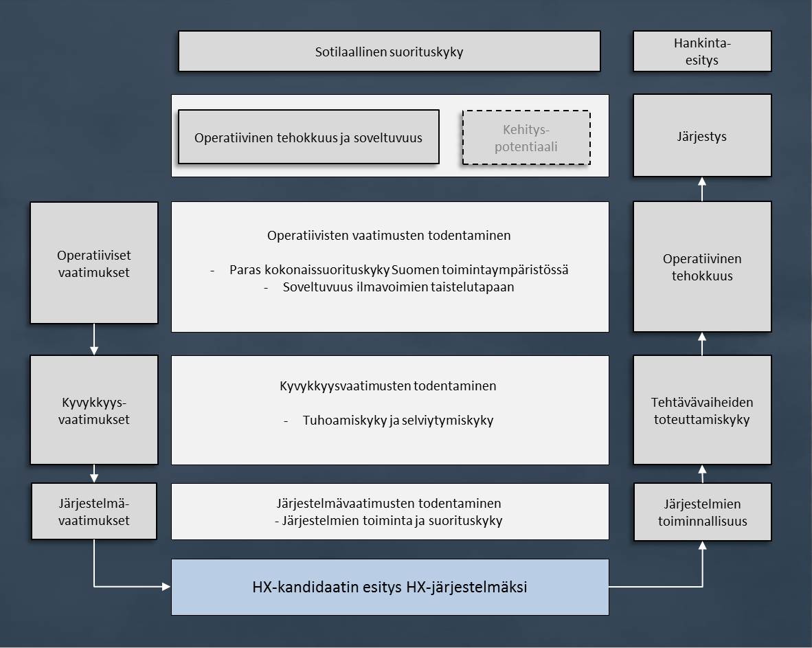 The assessment of the military capability of the HX candidates involves the effectiveness of the fighter candidates and their suitability for conducting operations in Finland’s operational environment including all of their separate stages. In addition, the candidates’ potential for future development is assessed. For layout technical reasons, the picture shows the chaining up of the assessment process only as concerns the first operational requirement. (Click the picture to make it larger in a new window.)
