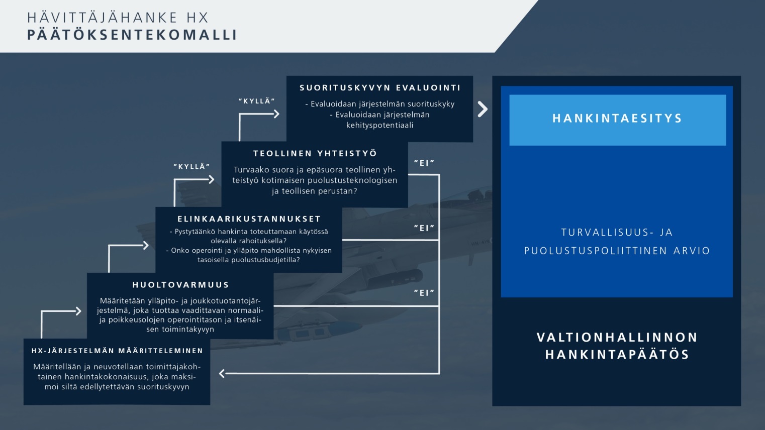 The aim of the decision-making model is to come up with an optimal total package with each HX candidate in cooperation with the aircraft manufacturer. In other words, in the phase following the sending of the Requests for Quotation we strive to negotiate and build the Gripen, Rafale, Eurofighter, Super Hornet and F-35 solution the best suited for Finland. The decision-making model strives to come up with the best comprehensive solution from the perspective of five decision-making areas, namely security of supply, life cycle costs, industrial participation and military capability, and on the basis of the security and defence policy assessment conducted under the Ministry of Defence.